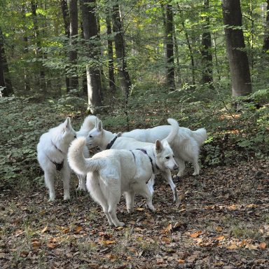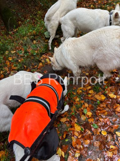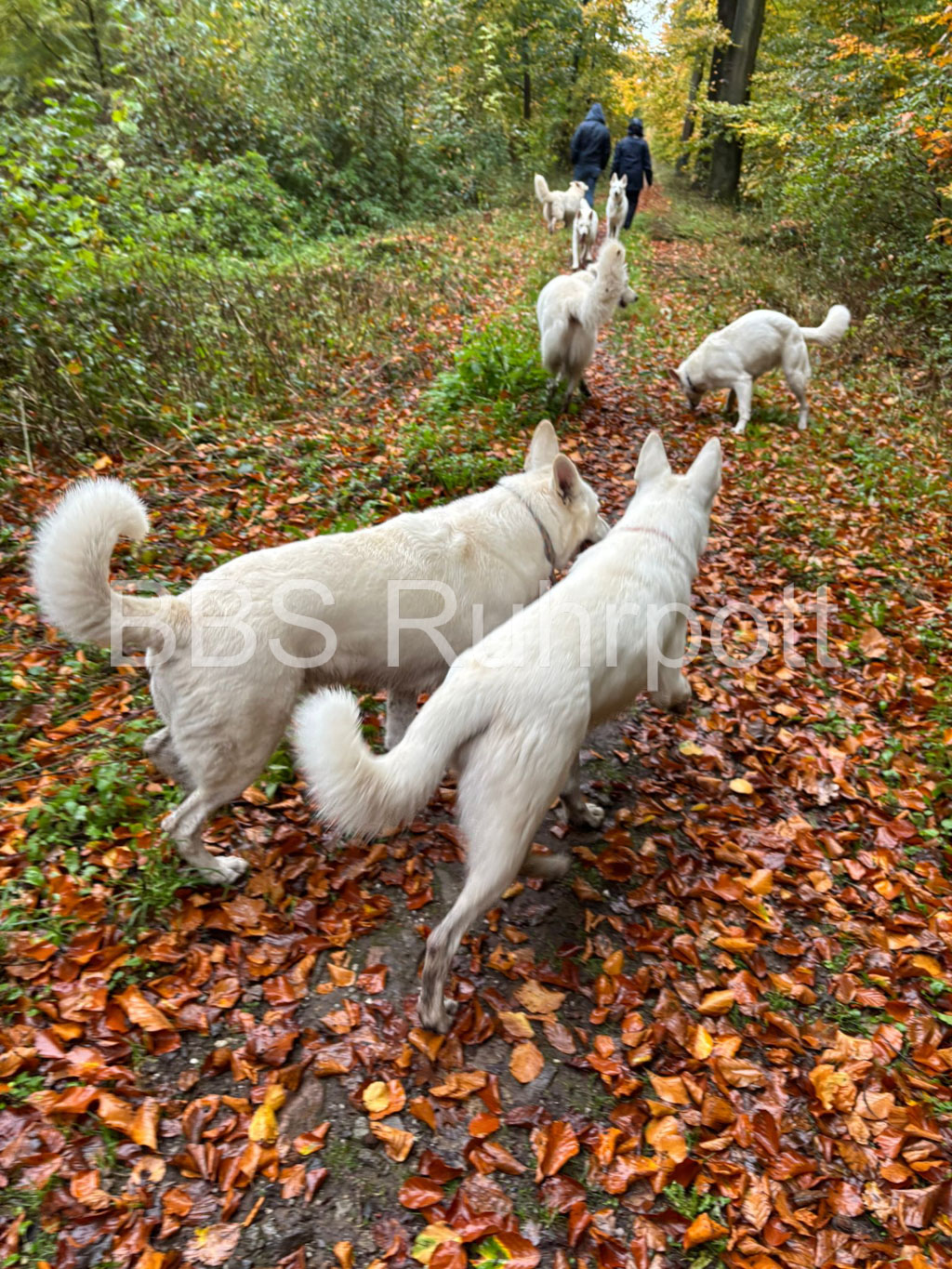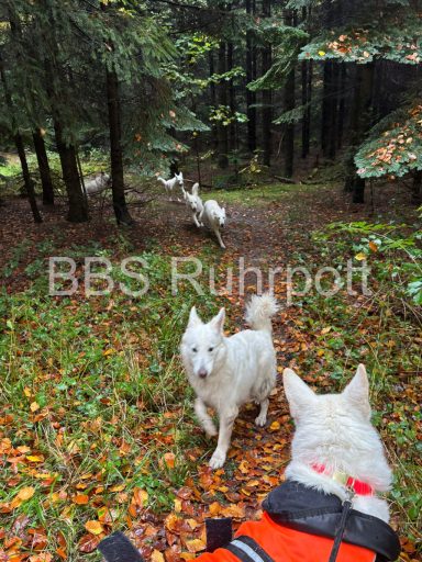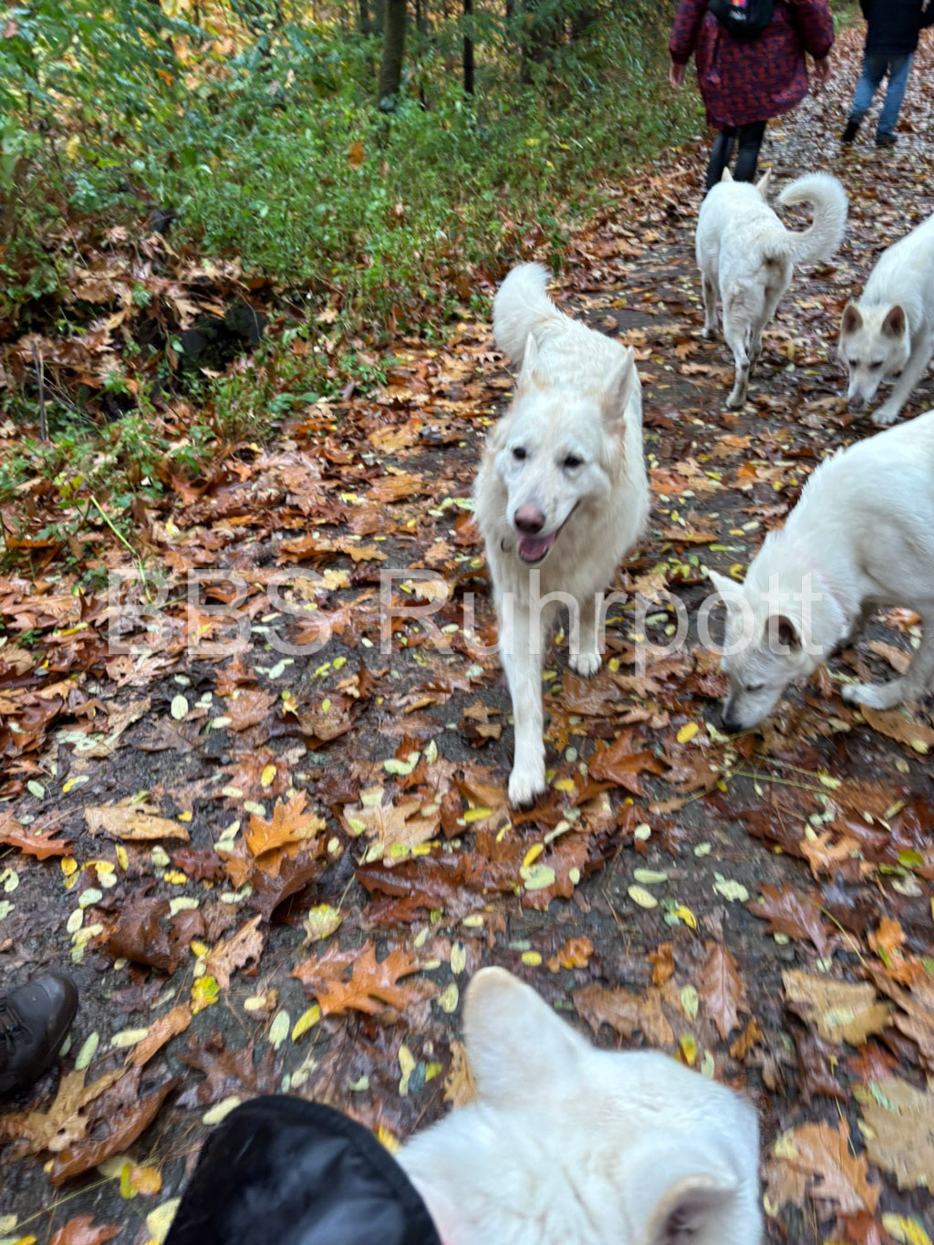 Trotz des durchwachsenen Wetters traf sich am Allerheiligen-Wochenende die fröhliche Hundegruppe BBS-Ruhrpott der Weißen Schweizer Schäferhunde in der idyllischen Anholter Schweiz in Isselburg. Zehn strahlend weiße Schäferhunde und zwei Gasthunde machten sich gemeinsam mit ihren Zweibeinern auf zur Herbstwanderung.