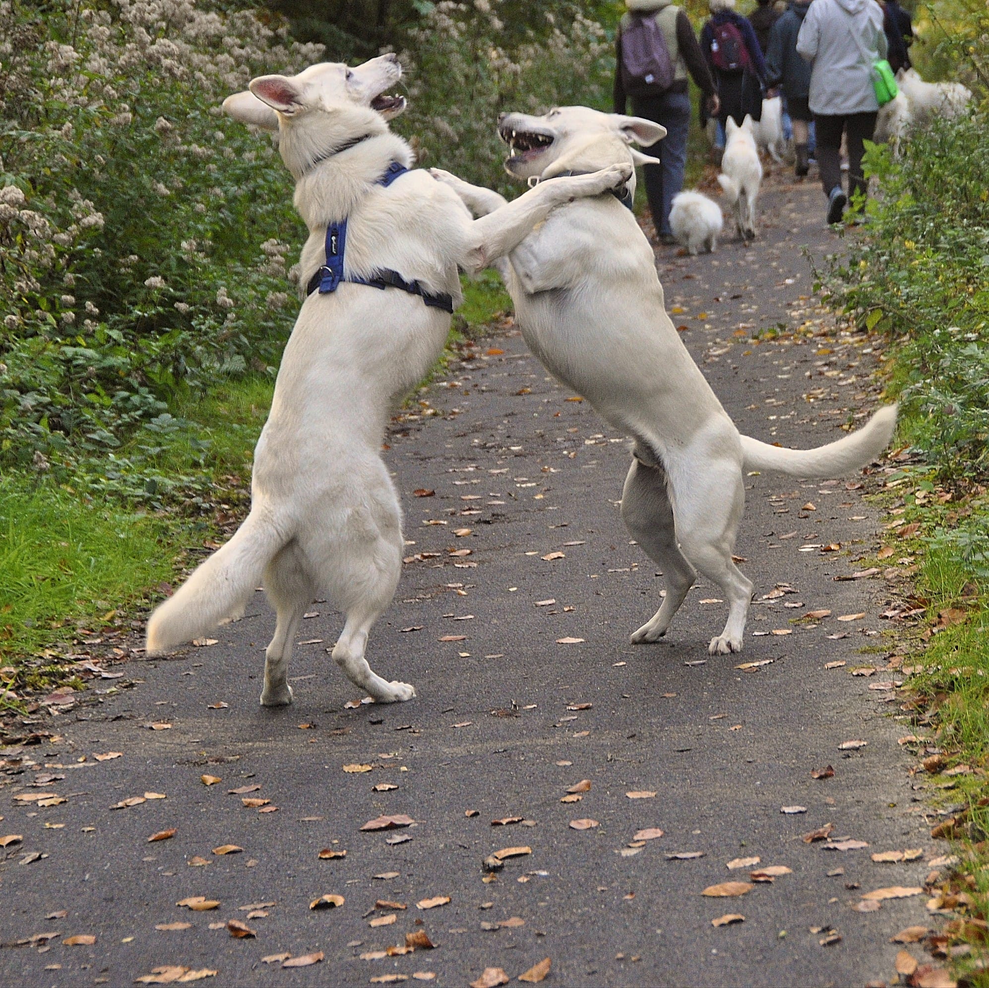 Schon beim ersten Zusammentreffen war die Stimmung ausgelassen. Freudiges Bellen, neugieriges Beschnuppern und viele wedelnde Ruten zeigten sofort: Hier treffen sich Freunde. Kaum waren die Hunde auf der Wiese unterwegs, begann das ausgelassene Toben. Die weißen Fellnasen jagten sich über das Gelände, spielten miteinander und genossen sichtlich die gemeinsame Zeit.
