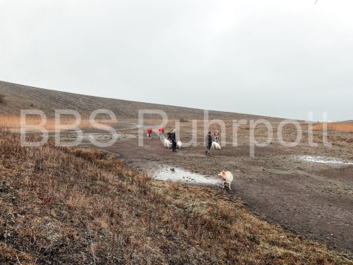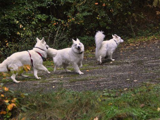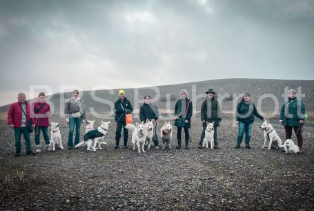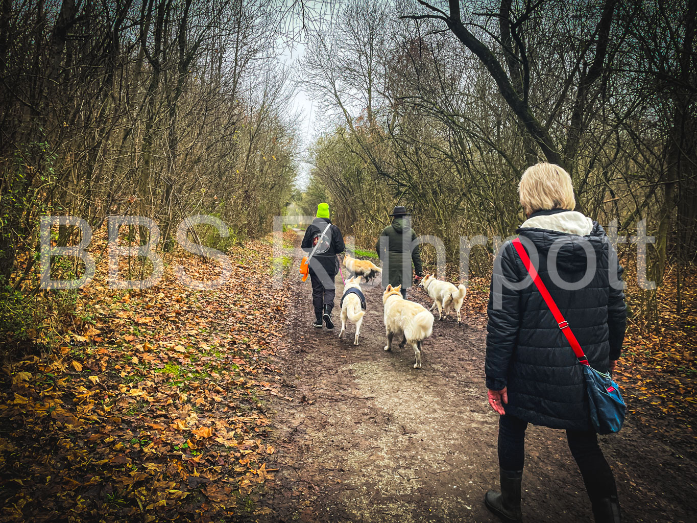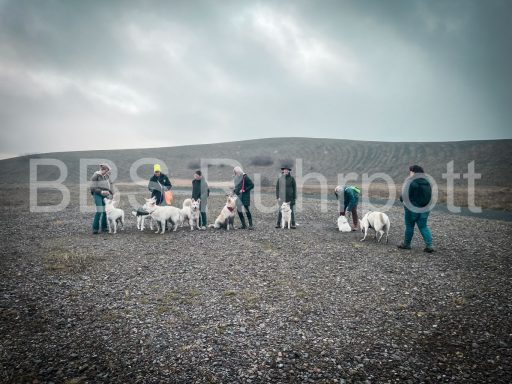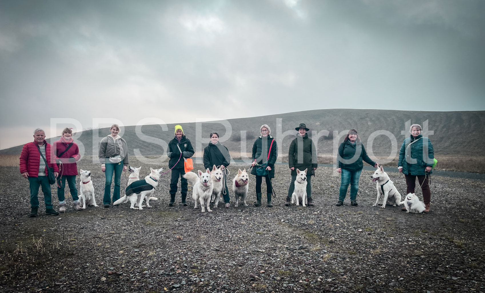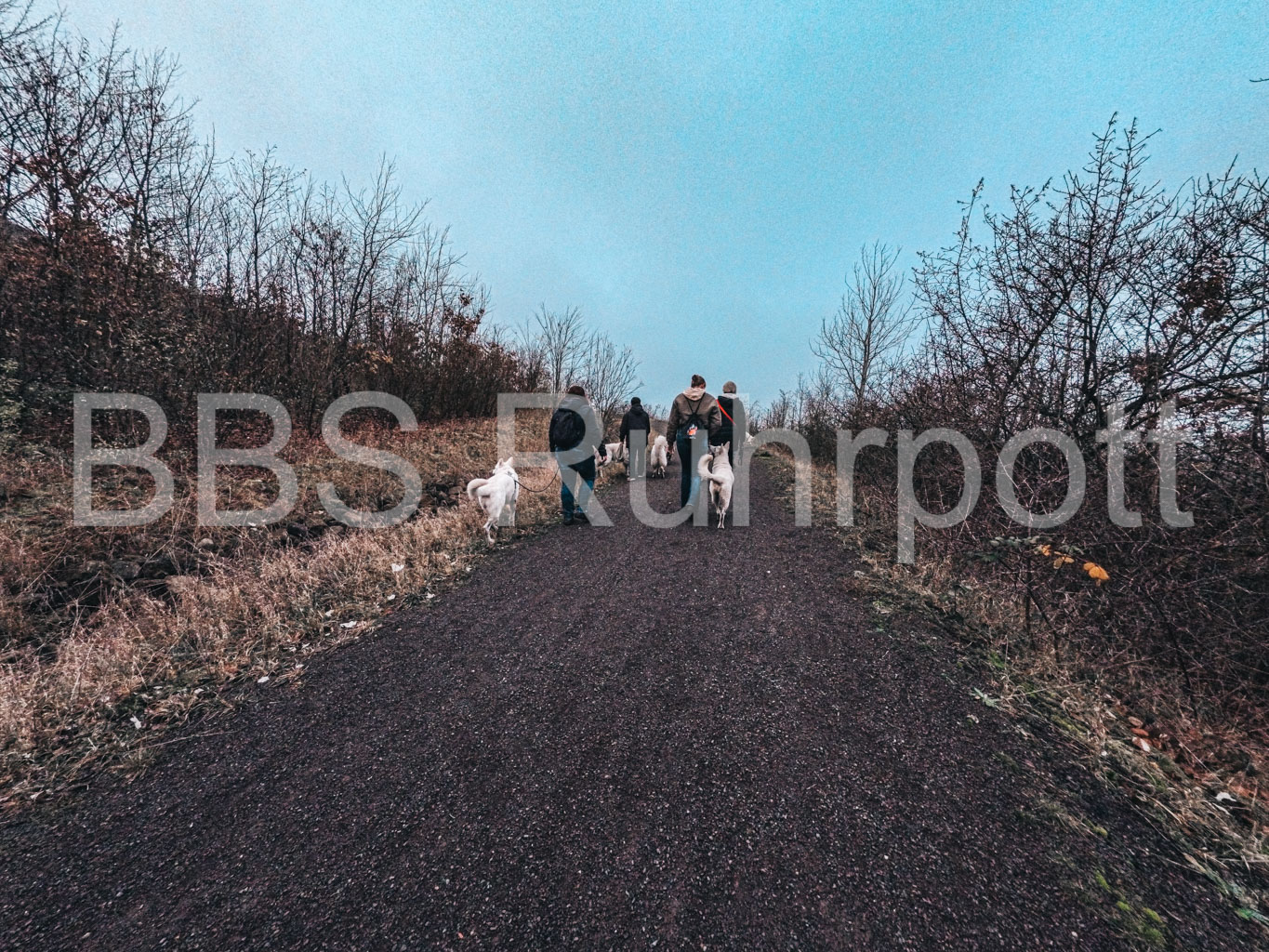 Trotz grauem Himmel strahlen die weißen Felle wie Lichtblicke im Revier. Es wird gelacht, fotografiert, gestaunt. Die Hunde laufen harmonisch nebeneinander, aufmerksam, souverän, als wären sie ein eingespieltes Rudel.