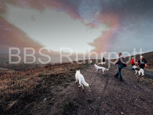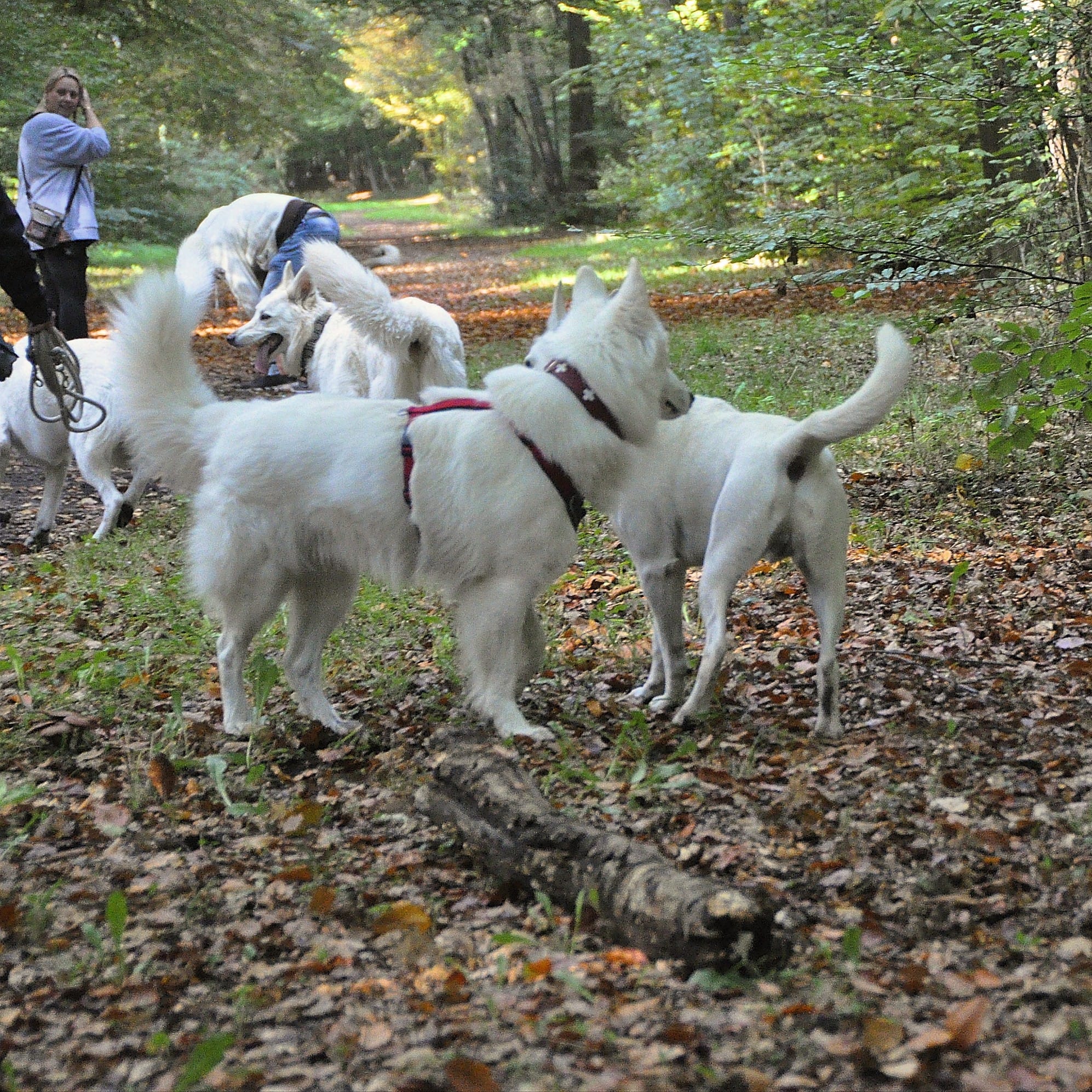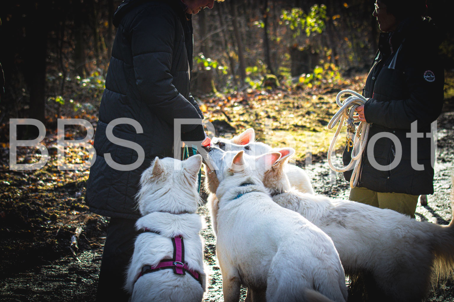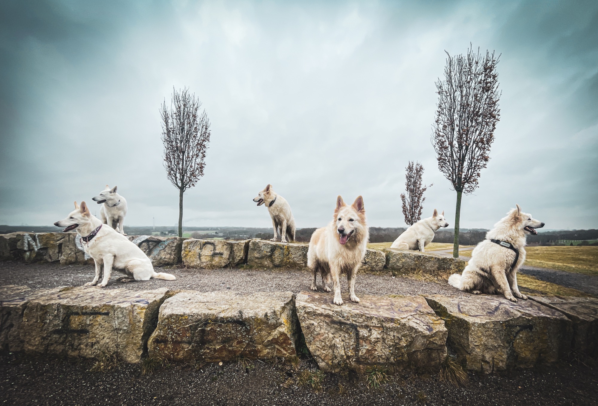Sechs Weiße Schweizer Schäferhunde der Hundegruppe BBS-Ruhrpott versammeln sich. Majestätisch, kraftvoll – und doch voller Sanftmut. Vertraute Gesichter auf zwei Beinen begrüßen sich herzlich, auf vier Pfoten wird geschnuppert, gewedelt, gespielt. Man kennt sich. Man freut sich.