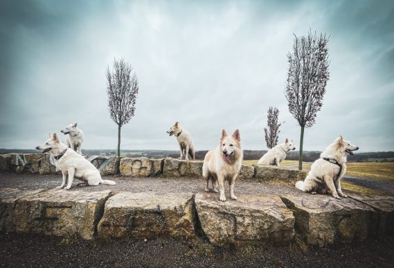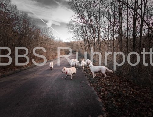 Neun Weiße Schweizer Schäferhunde zogen gemeinsam durch die winterliche Landschaft Wuppertals. Ihre hellen Felle leuchteten in der Sonne, während die klare, kalte Luft ihre Atemwolken sichtbar machte. Trotz der Kälte lag Wärme in der Luft – eine Wärme, die von fröhlichem Hundespiel, wedelnden Ruten und stiller Verbundenheit getragen wurde.